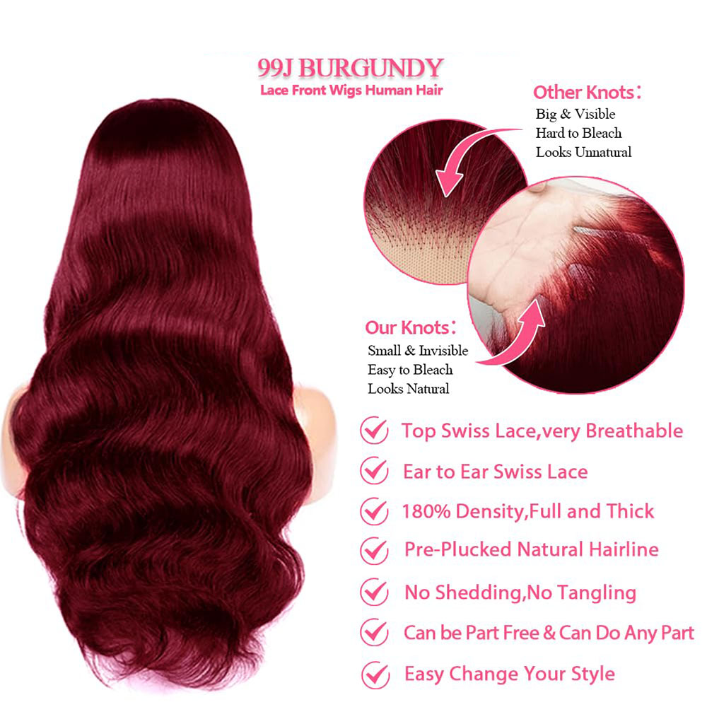 99J Burgundy 13x4 HD Lace Front Wig Body Wave Human Hair 180% Density Pre Plucked