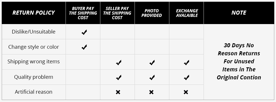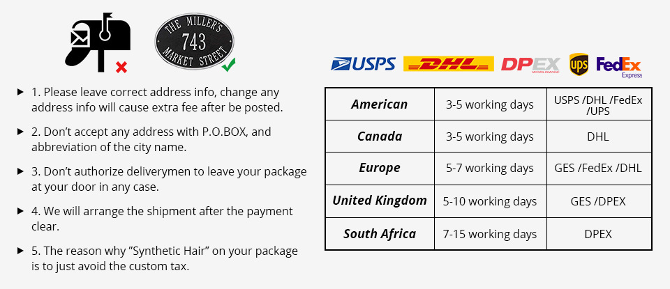 | Processing time | DHL/FedEx/UPS/TNT 3-7 Days After Shipping |